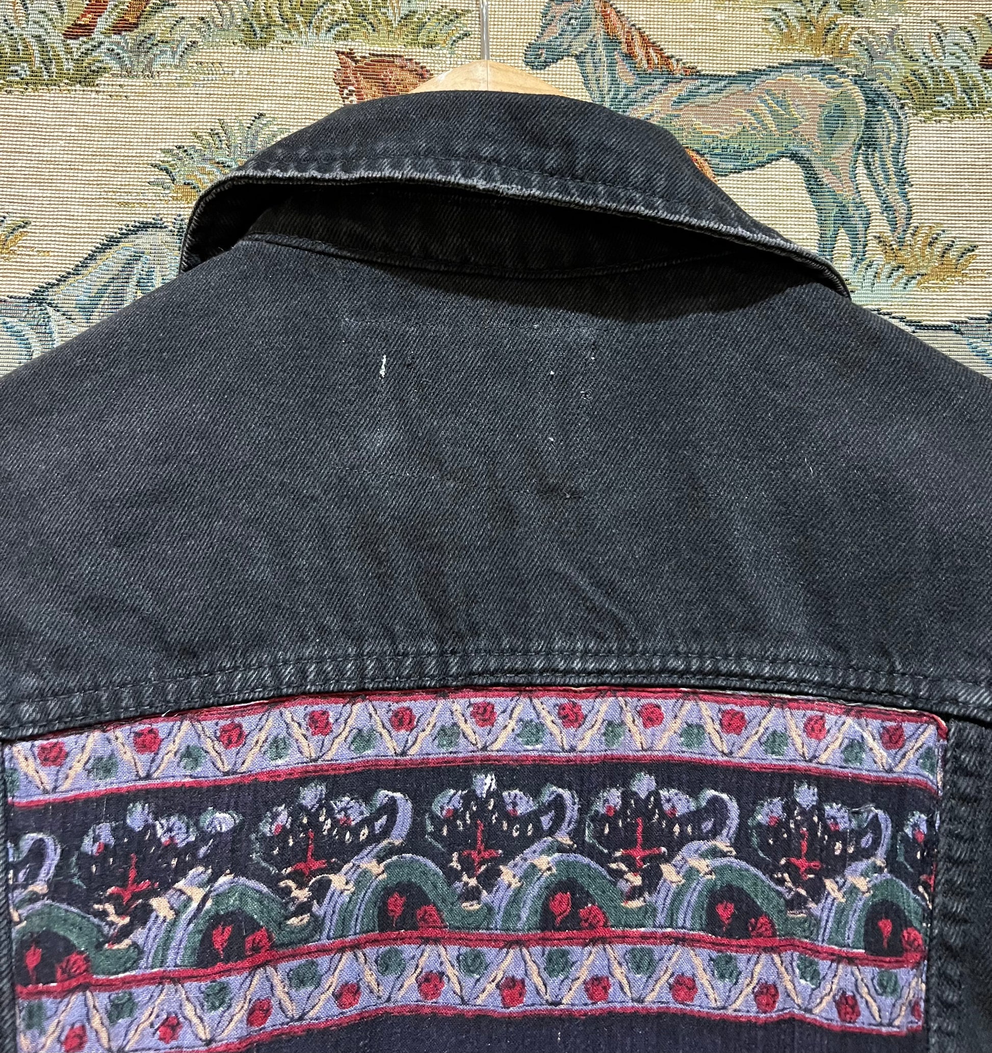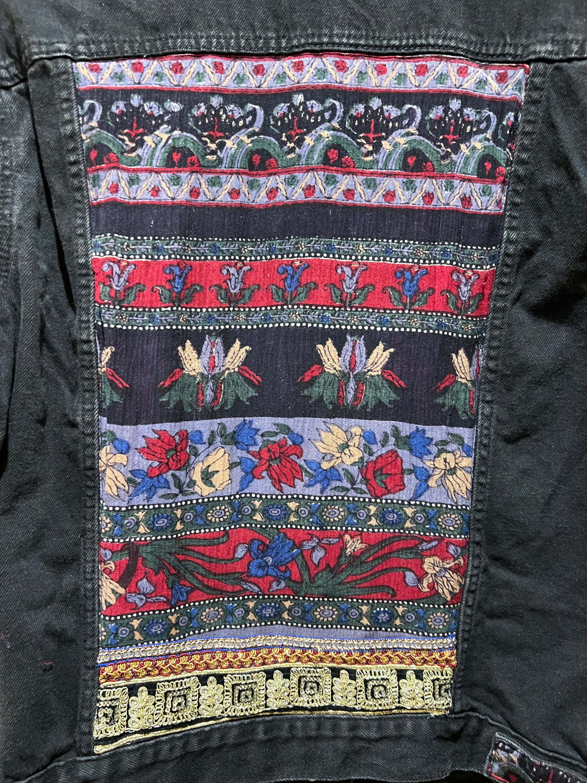 Preloved denim jacket laundered, repaired, decorated by hand with re used textiles and trims. Each piece is unique.