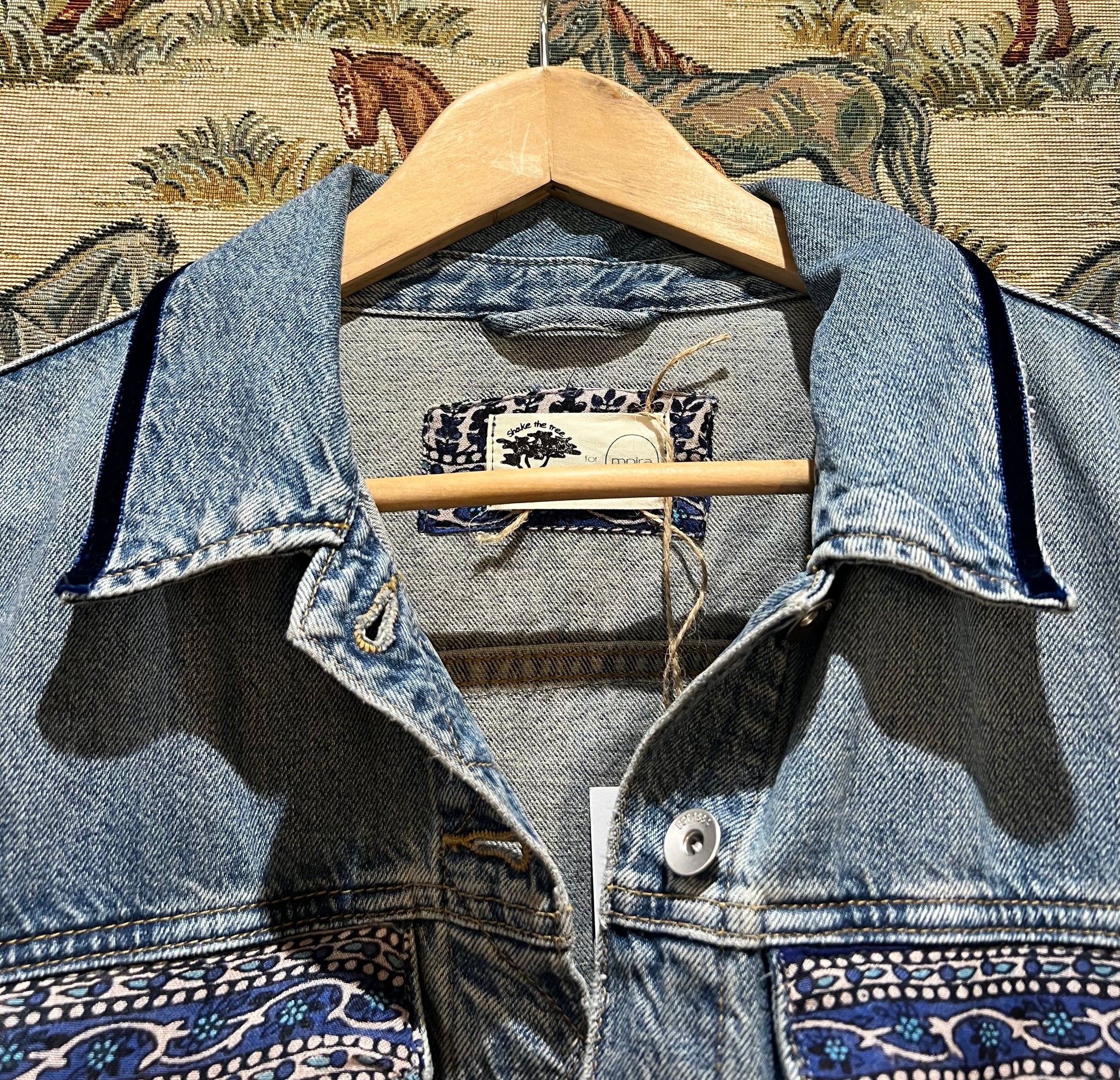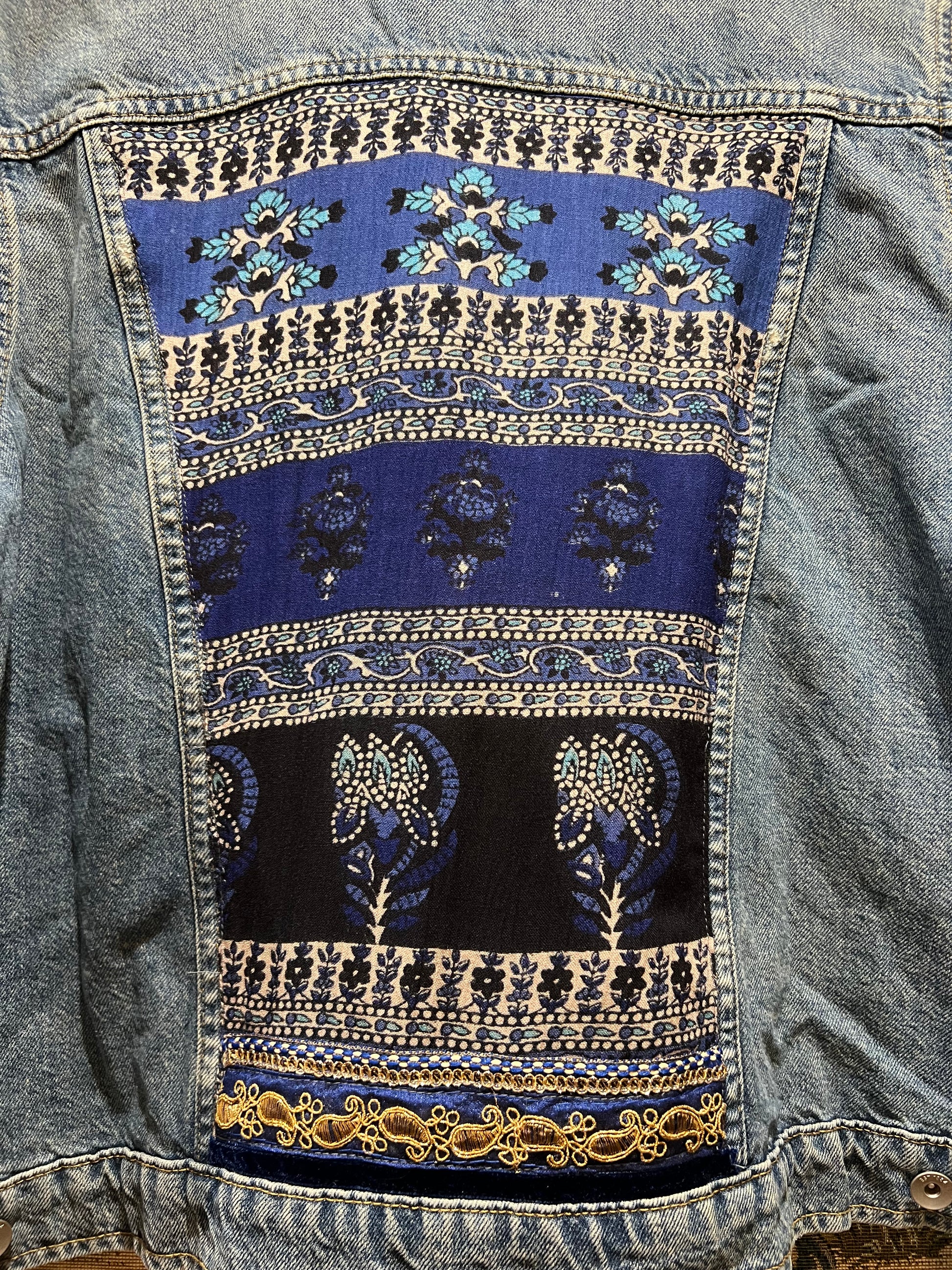 Preloved Denim Jacket laundered, repaired, decorated by hand with re used textiles and trims. Each piece is unique.