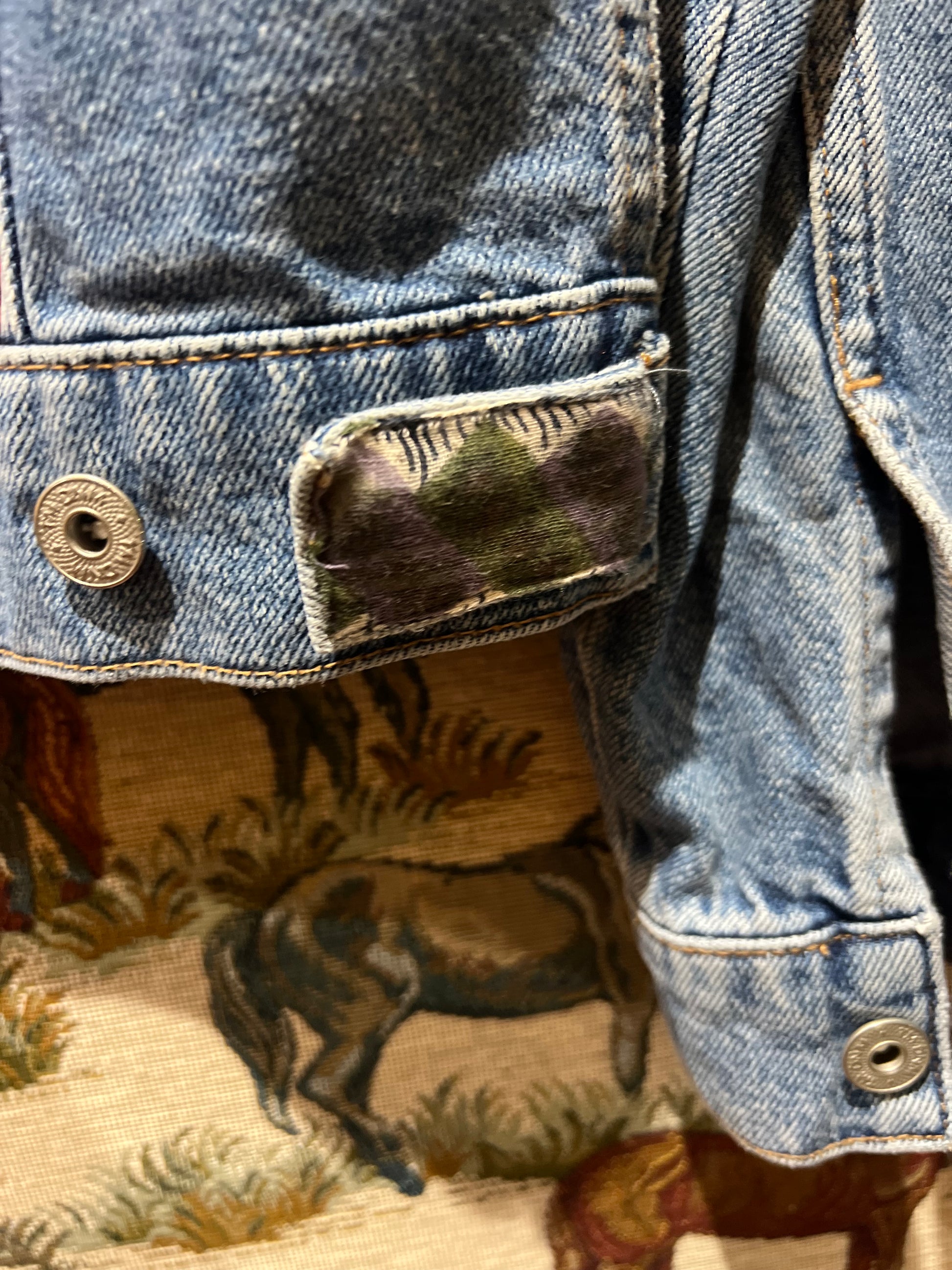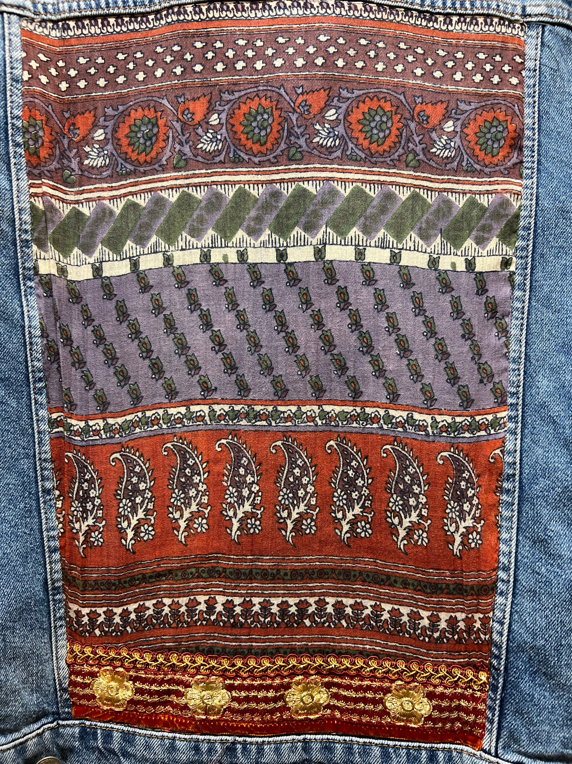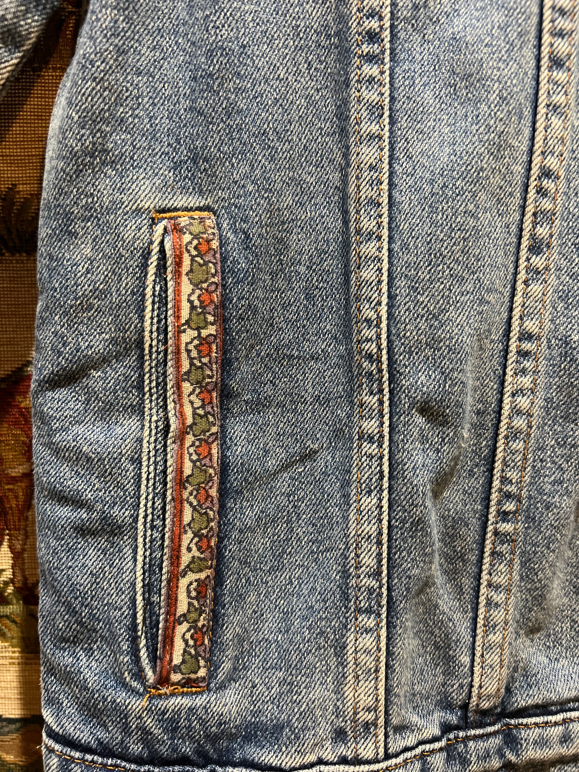 Preloved Denim Jacket laundered, repaired, decorated by hand with re used textiles and trims. Each piece is unique.