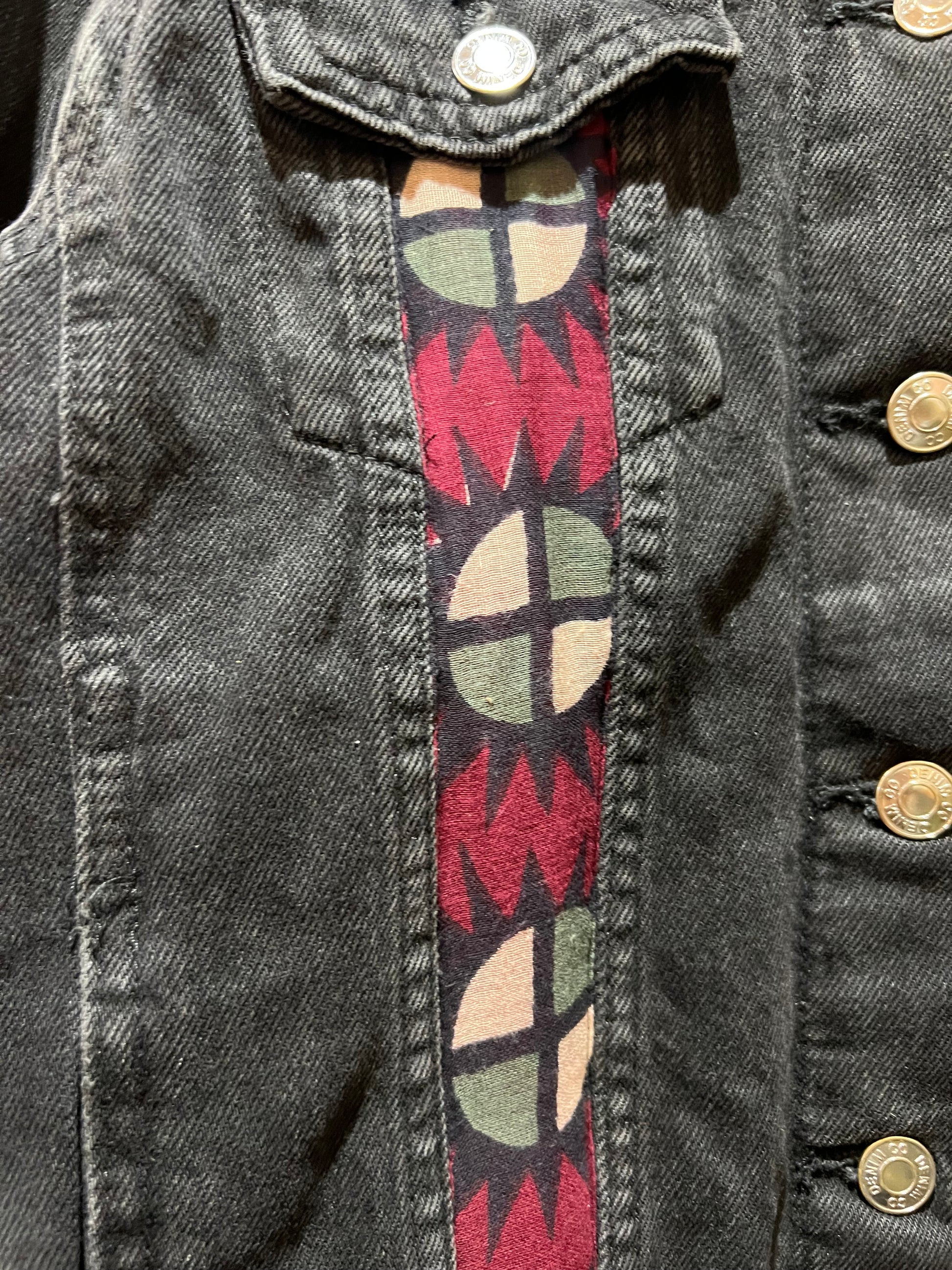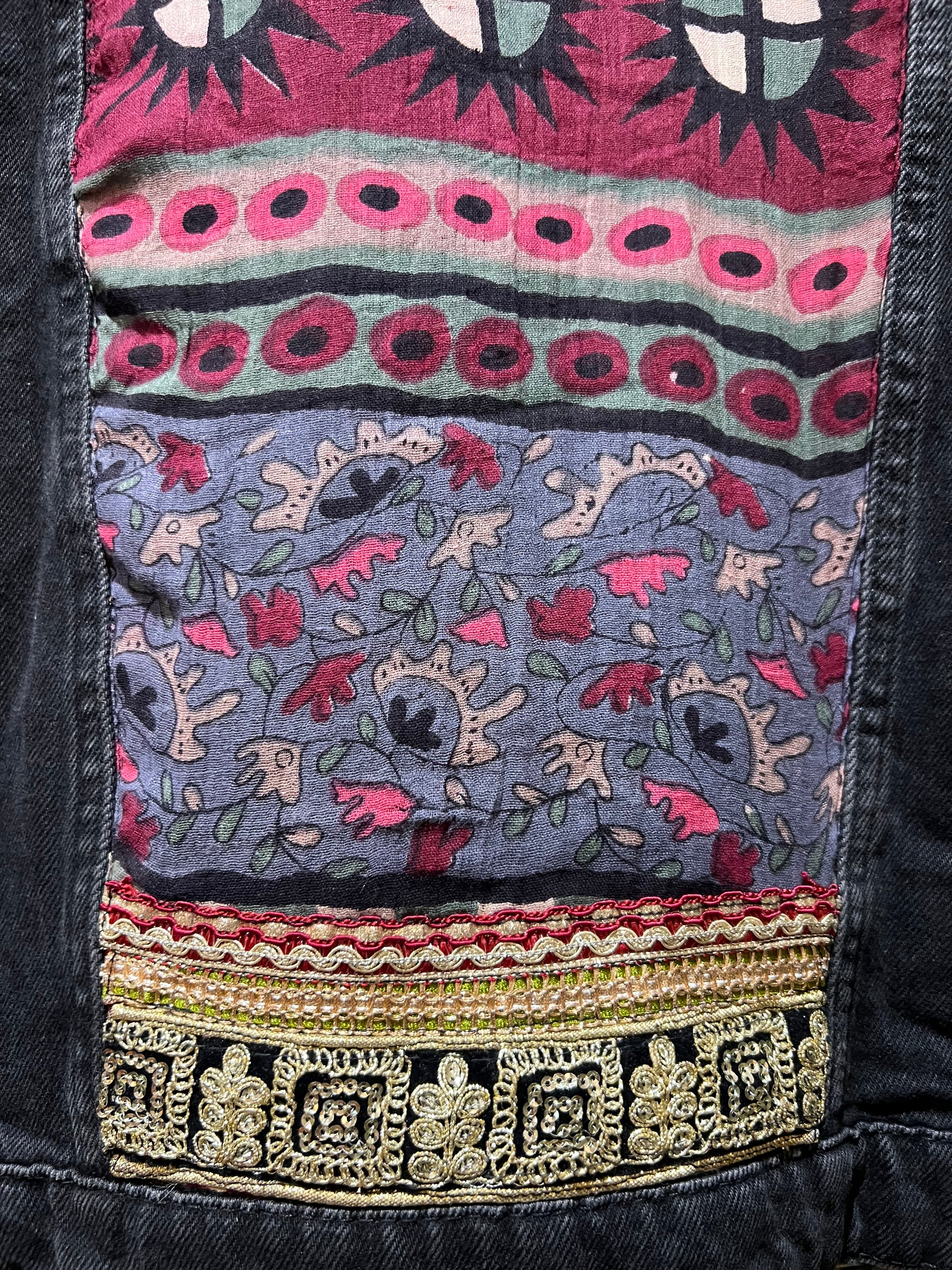 Preloved denim jacket laundered, repaired, decorated by hand with re used textiles and trims. Each piece is unique.