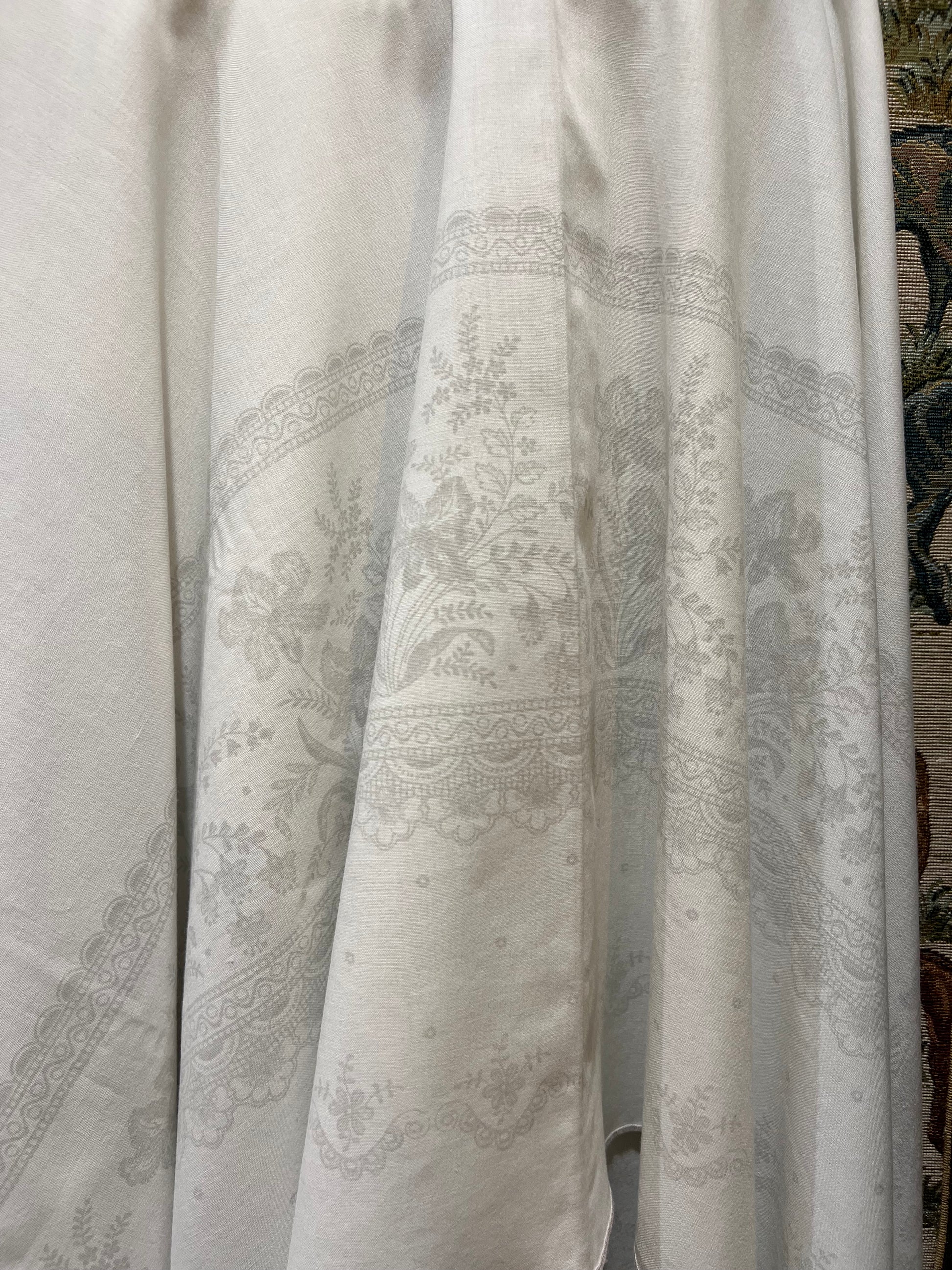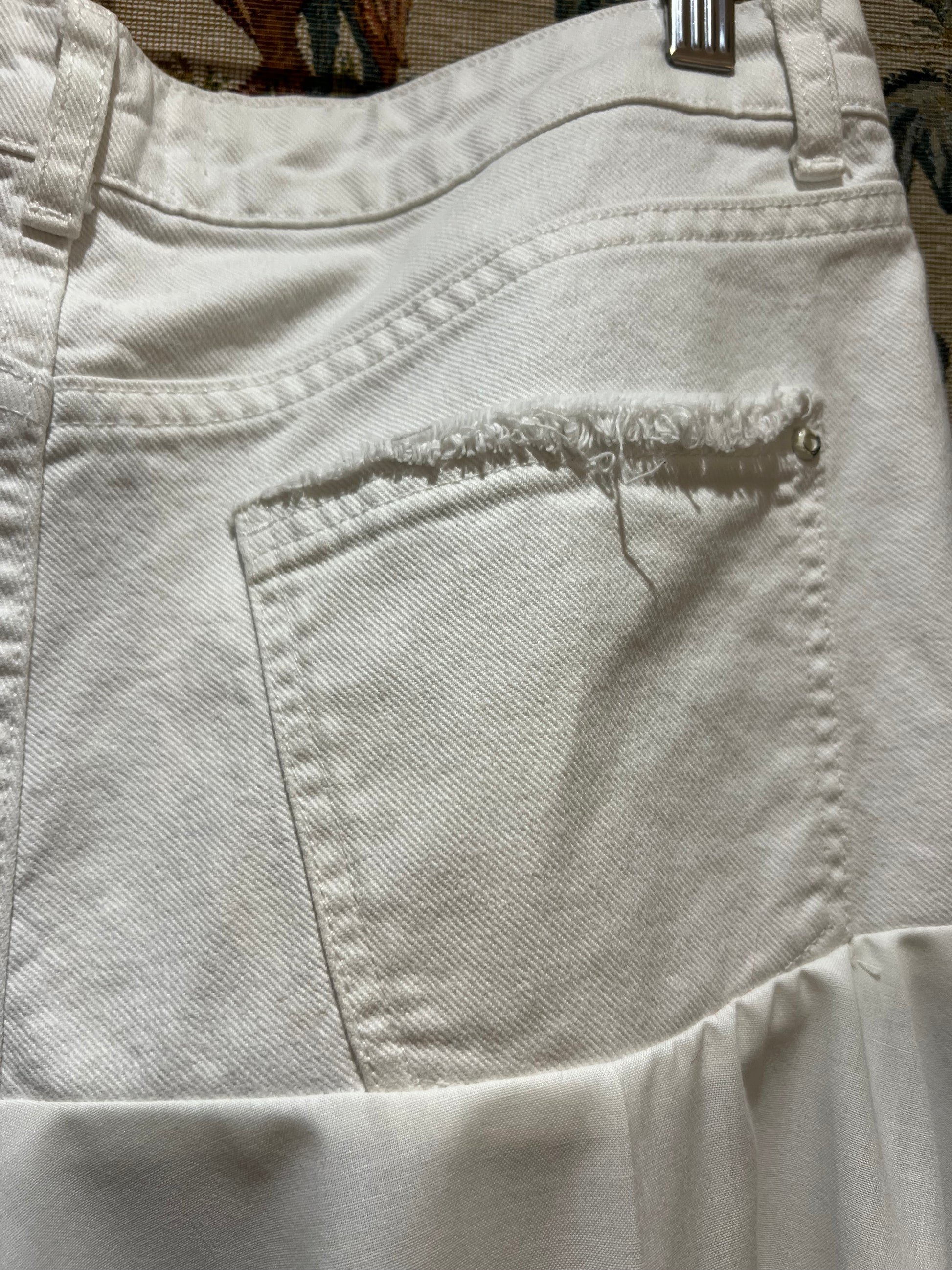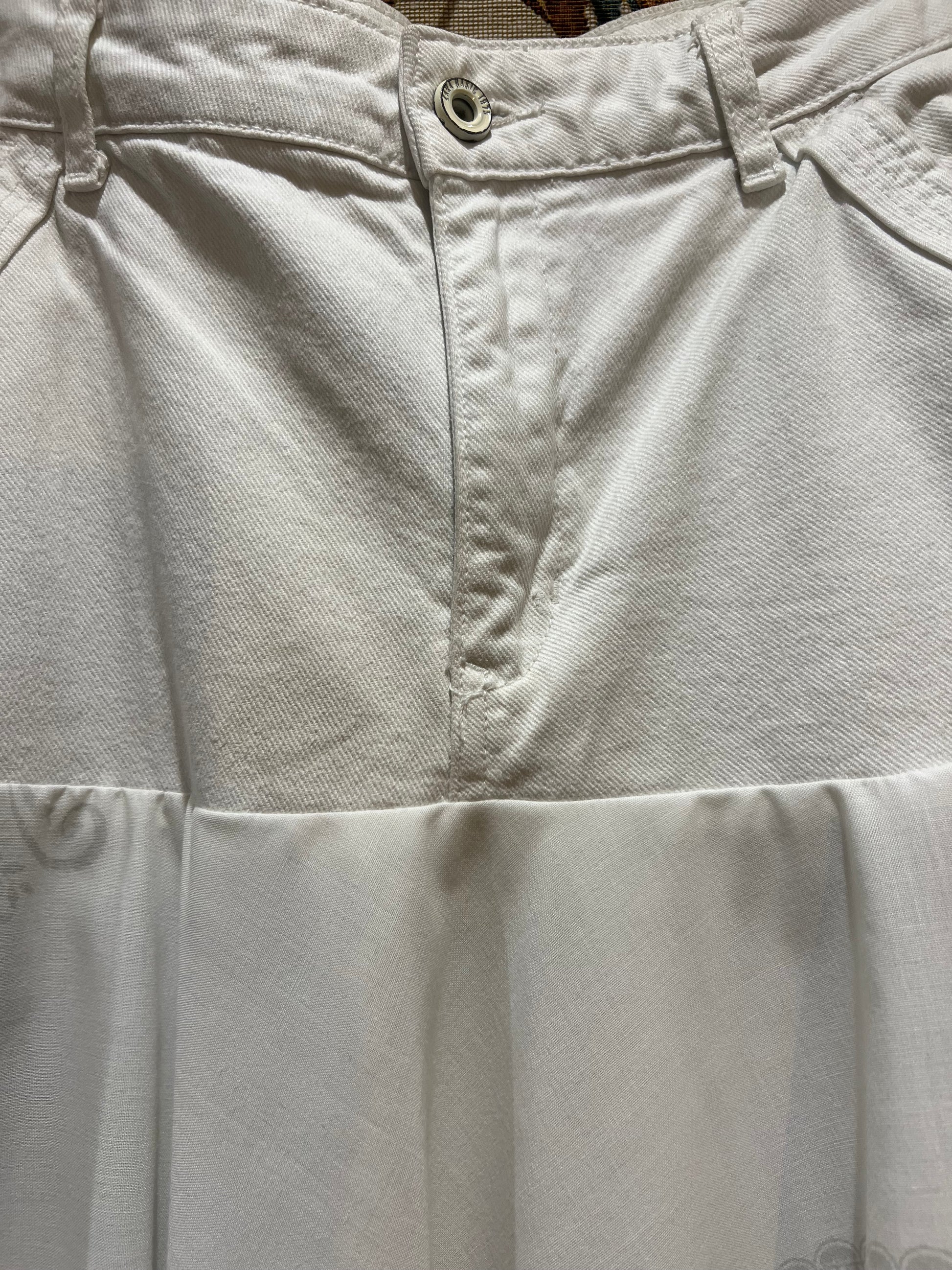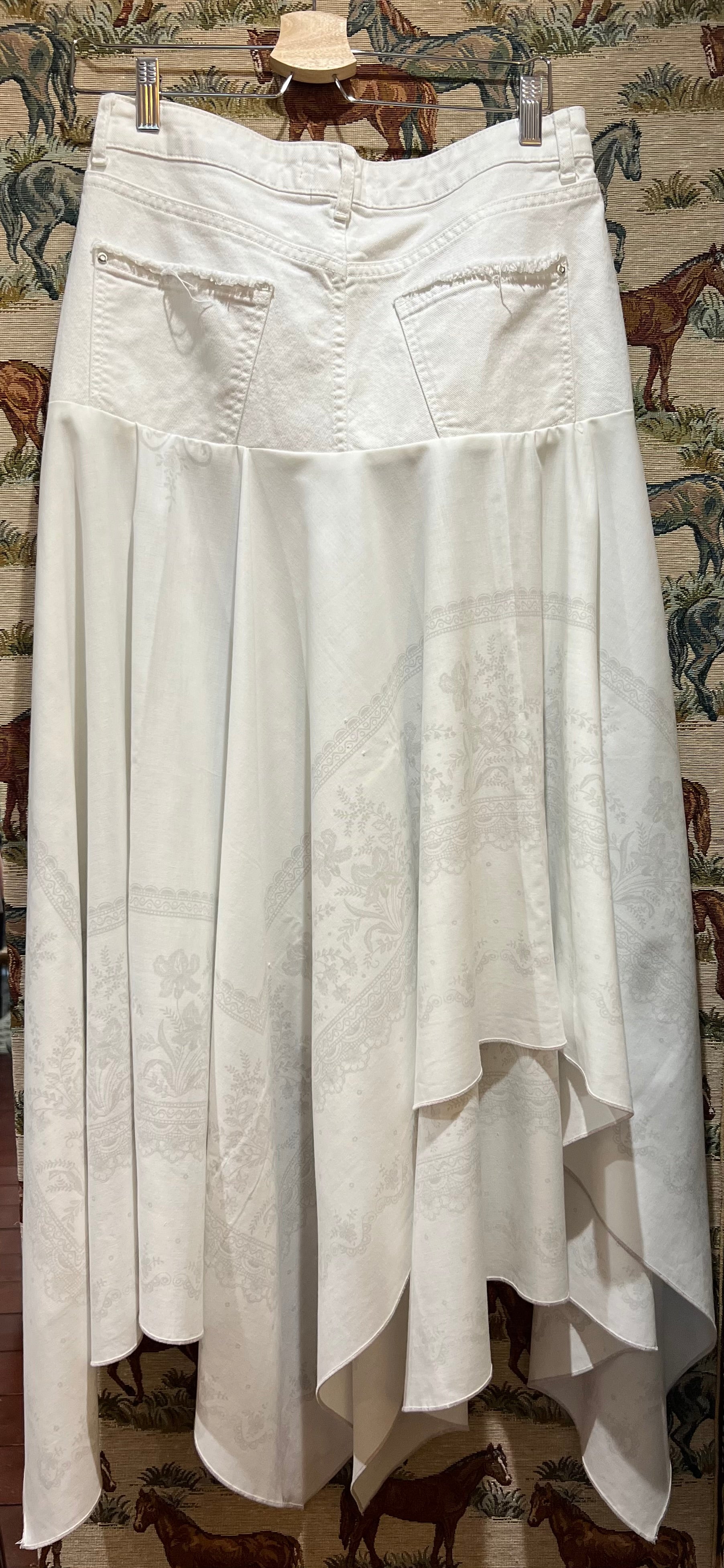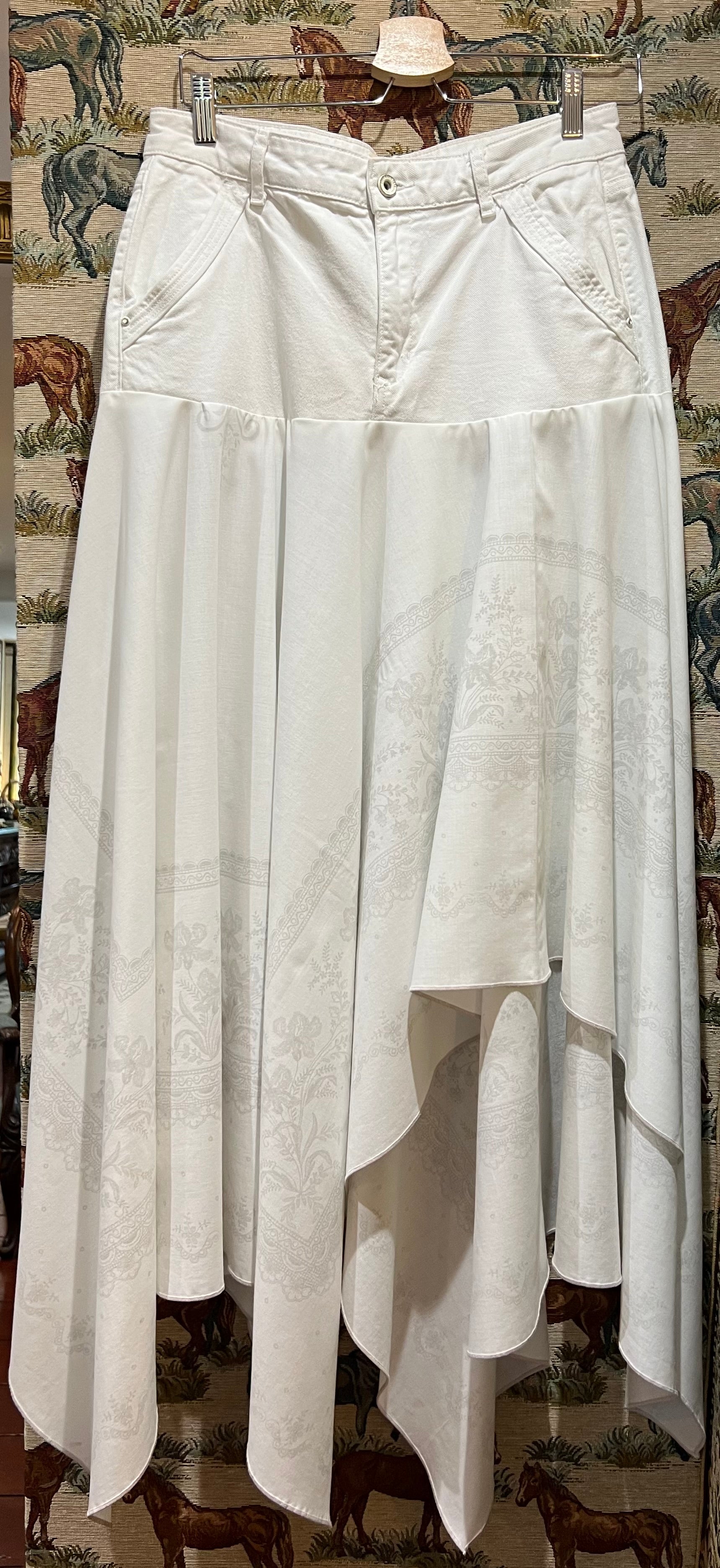 Preloved denim jeans cut to create a “hold me in” waist and hips with rescued preloved vintage fabric/ tablecloth/scarf skirt.