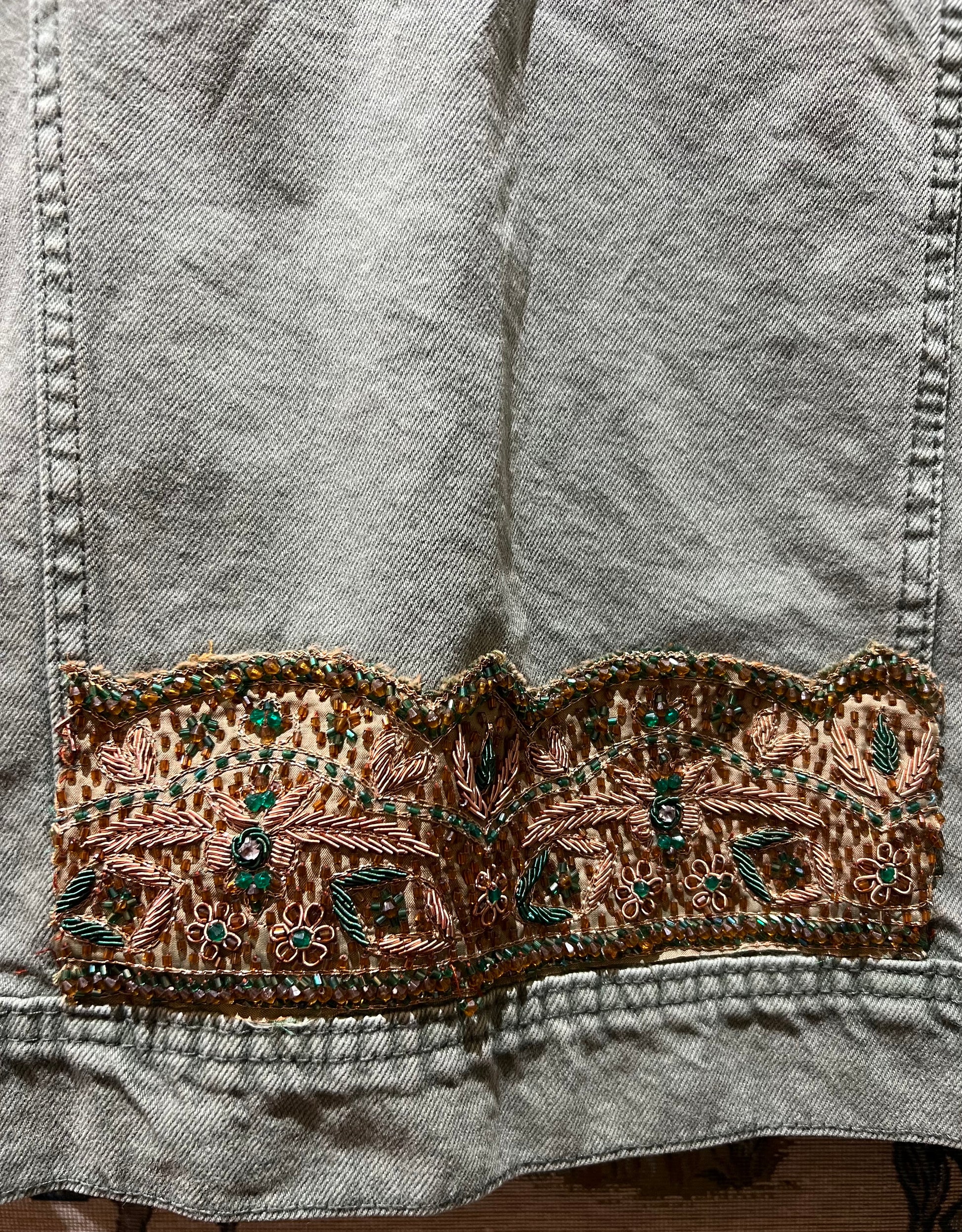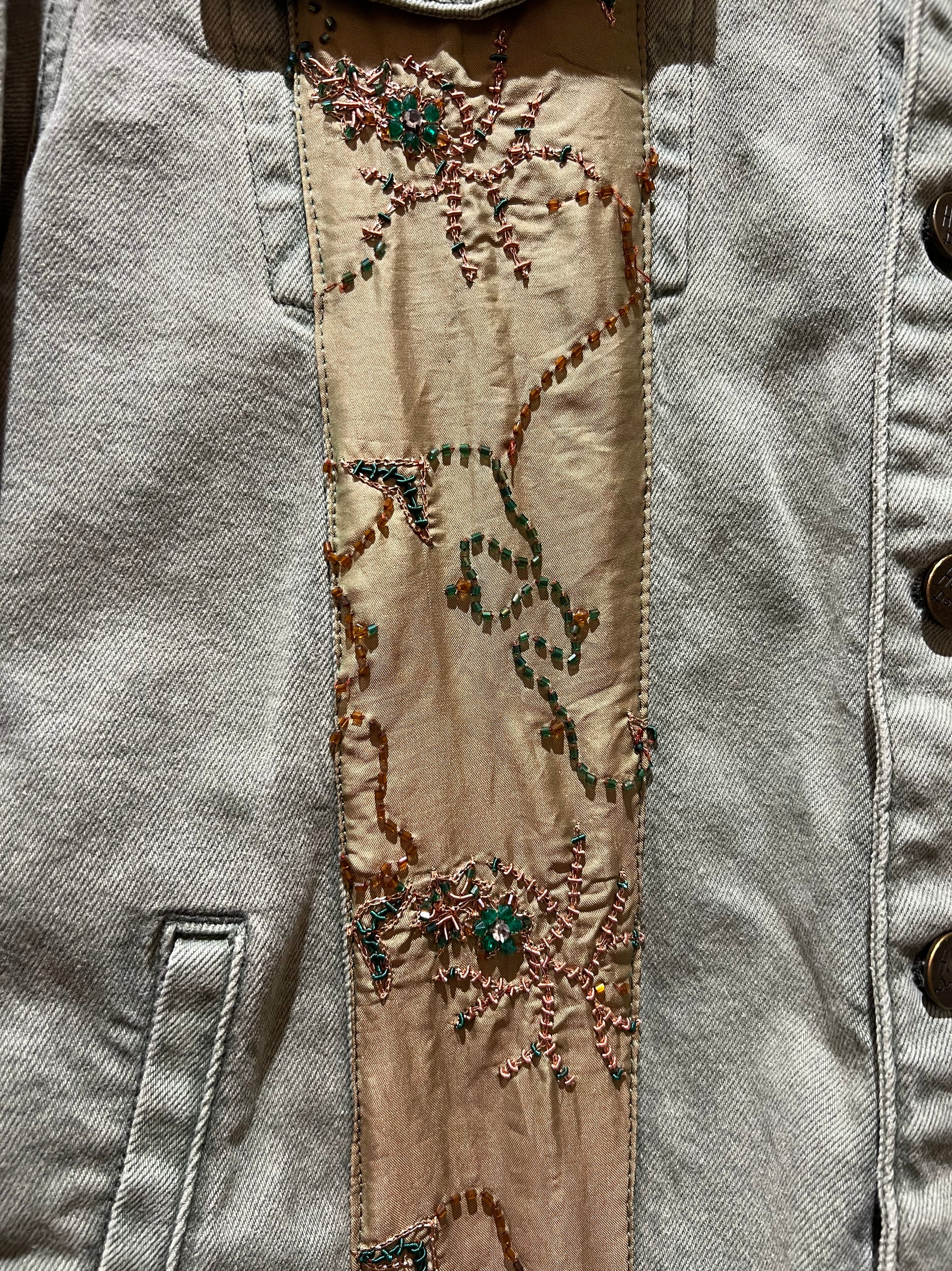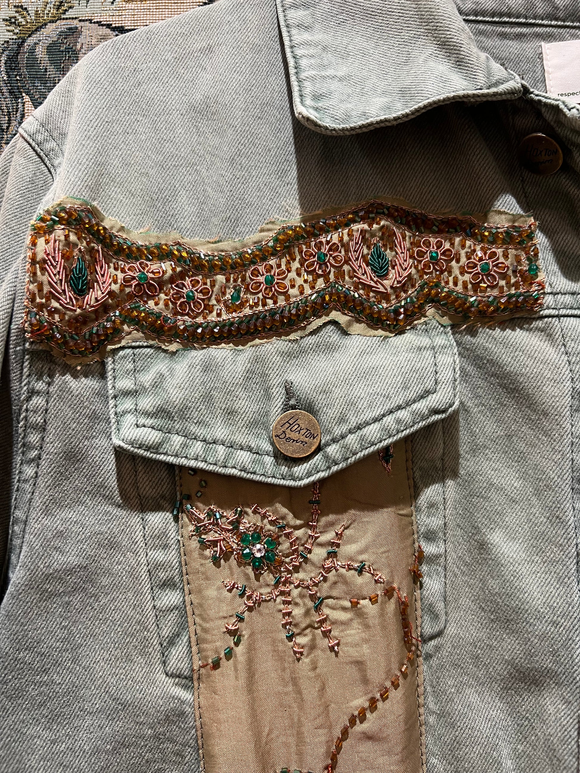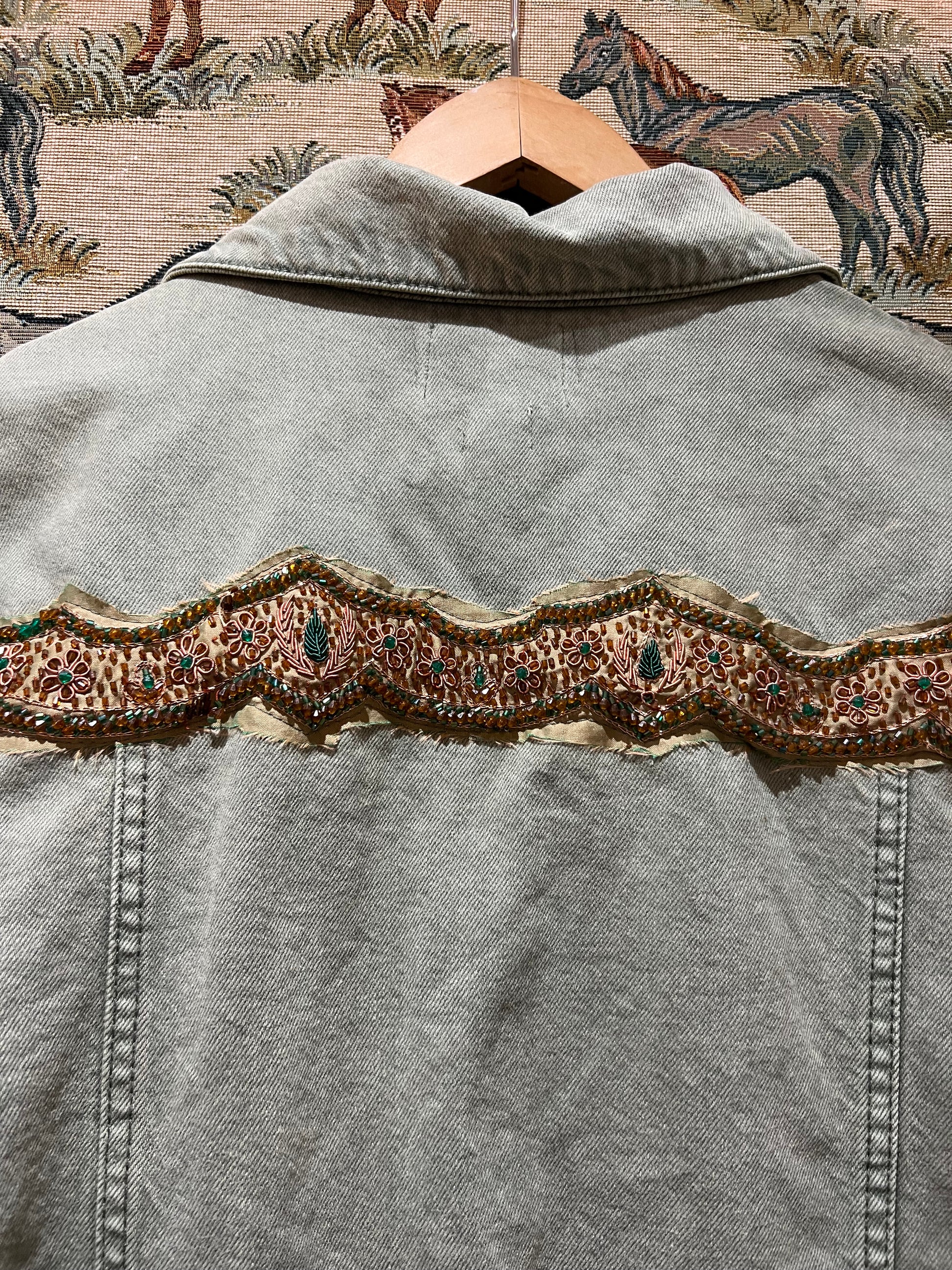 Preloved denim jacket laundered, repaired, decorated by hand with re used textiles and trims. Each piece is unique.