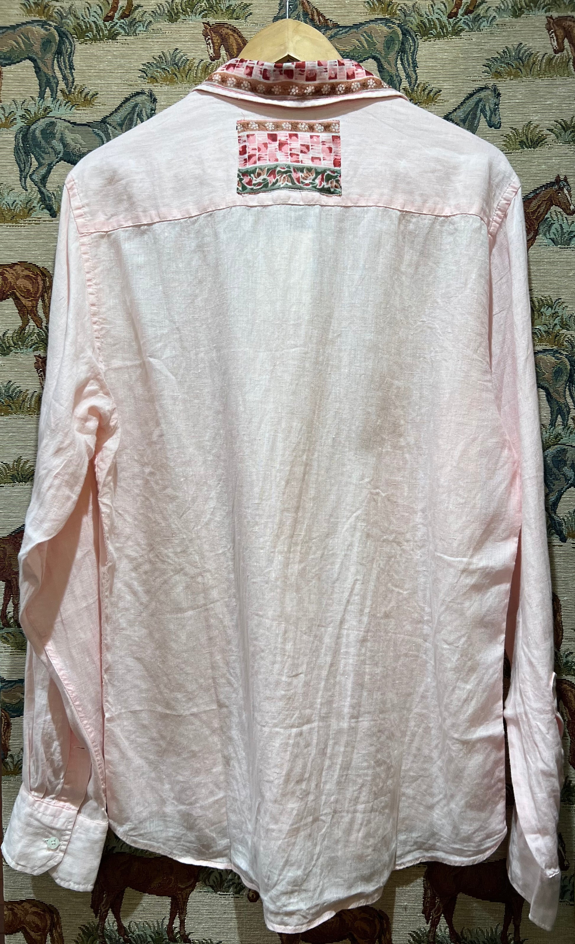 Preloved, laundered and given new life with collected and re used patterned cotton fabrics added to collar and cuffs.