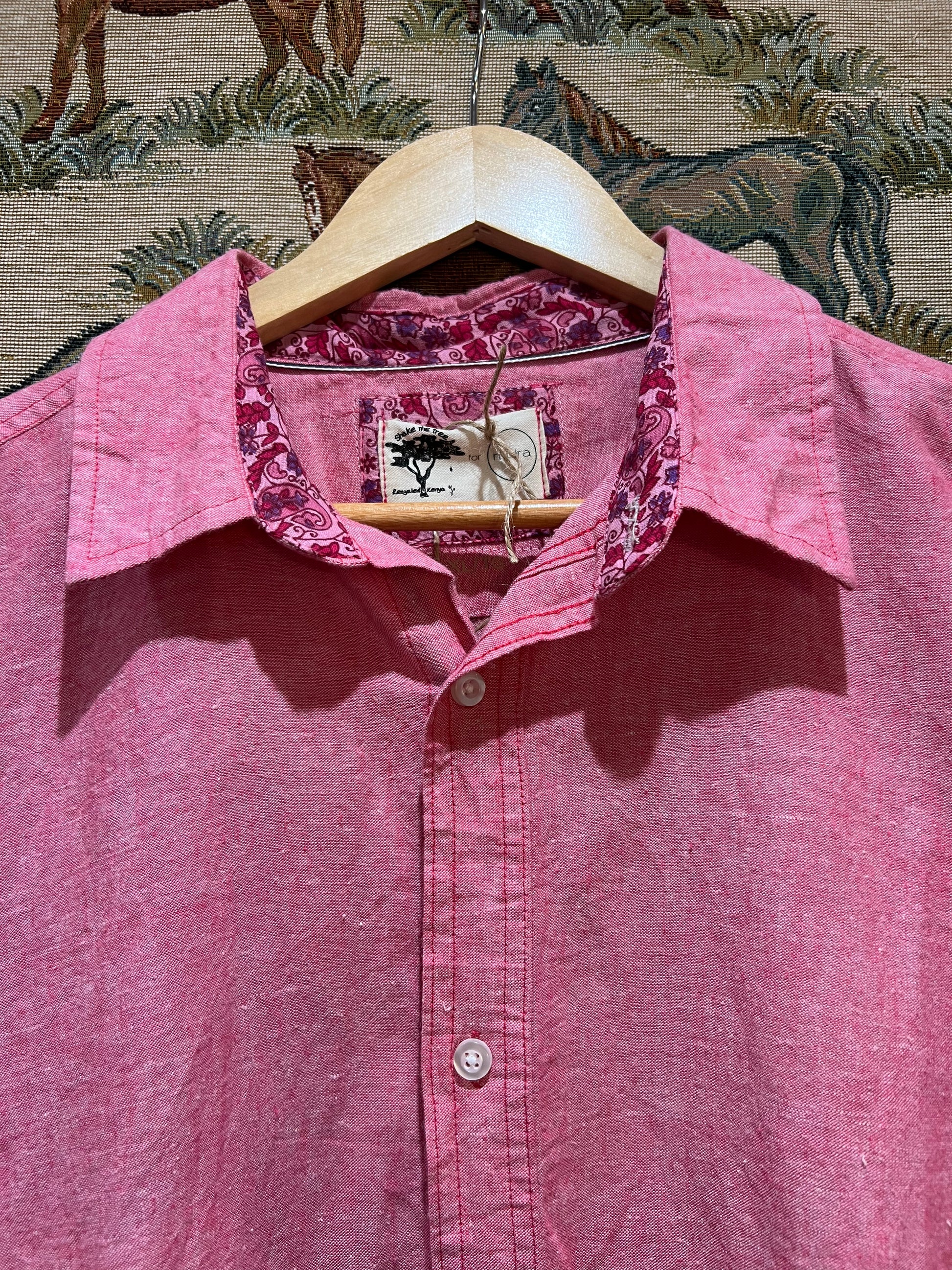 Preloved, laundered and given new life with collected and re used patterned cotton fabrics added to collar and cuffs.