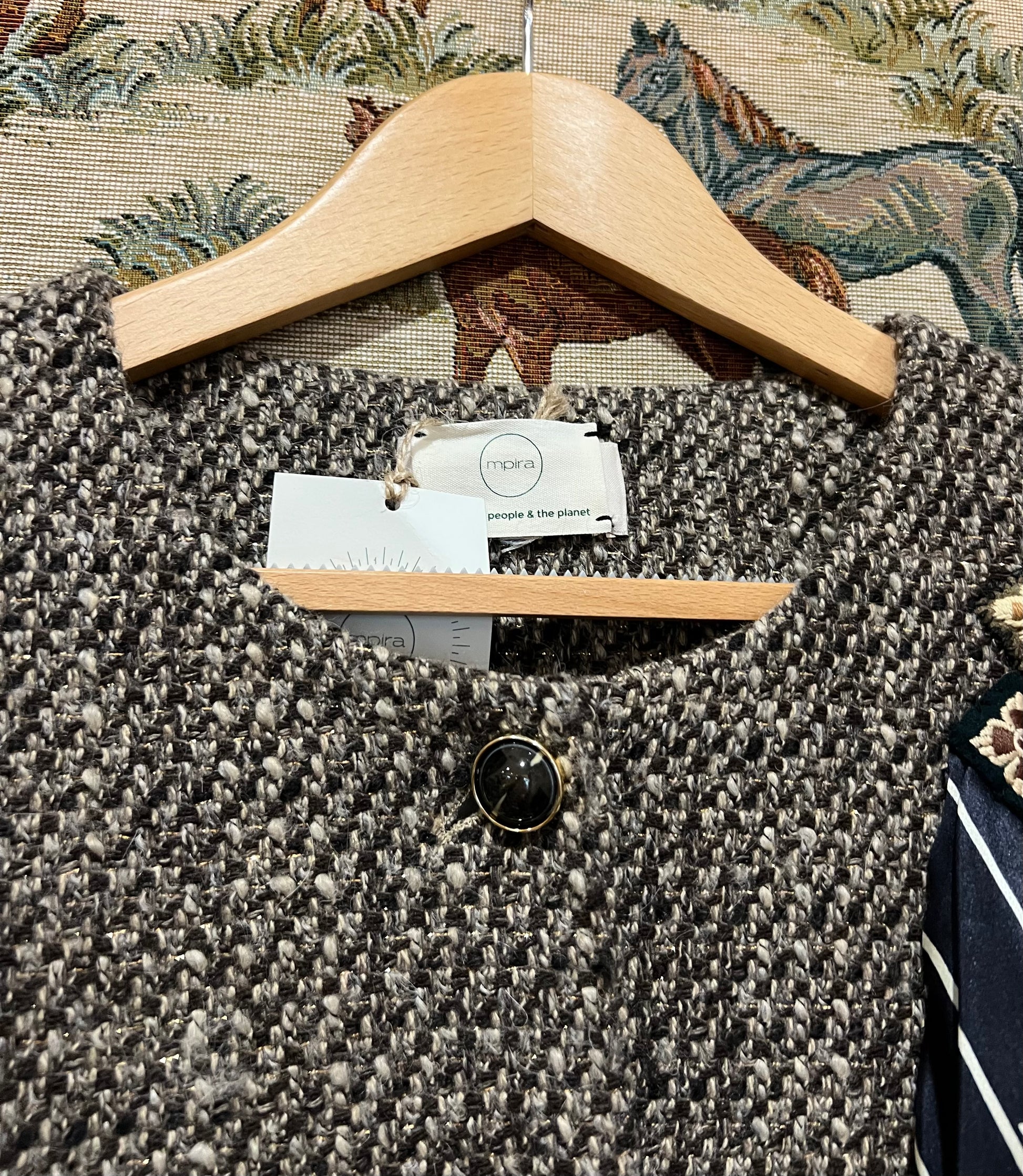 Preloved, laundered and given new life with collected and re used textiles and trims. Each piece is unique.