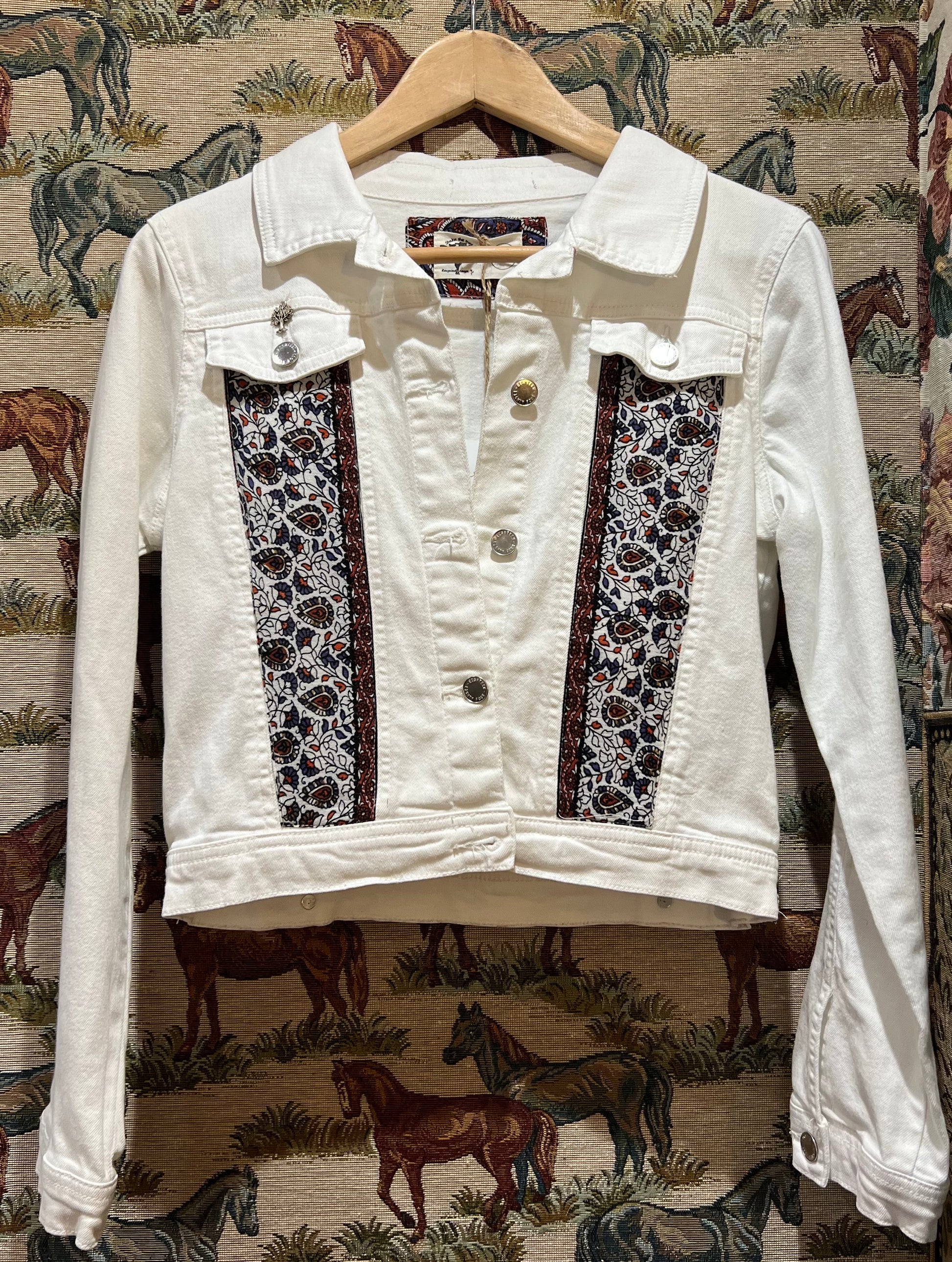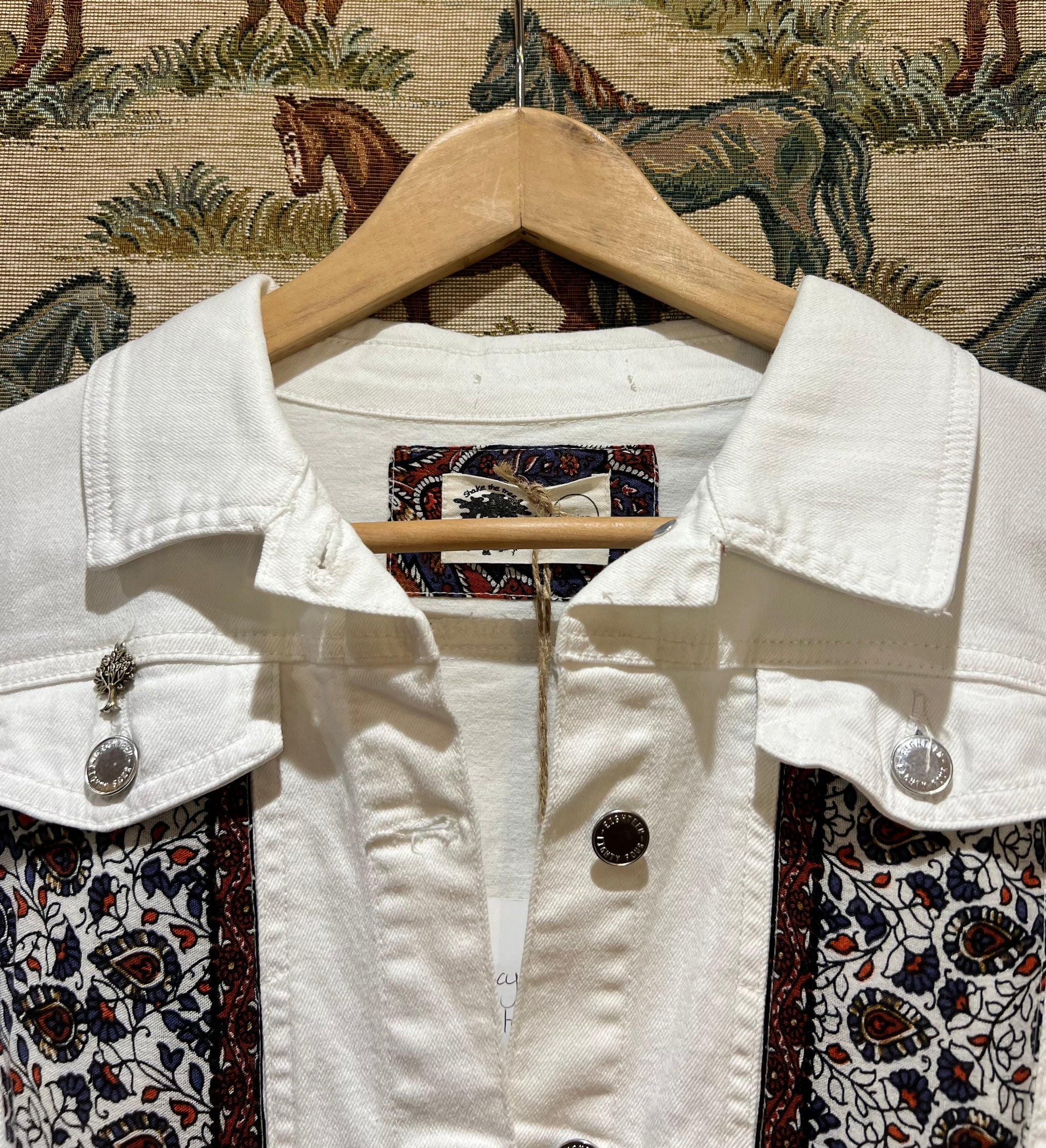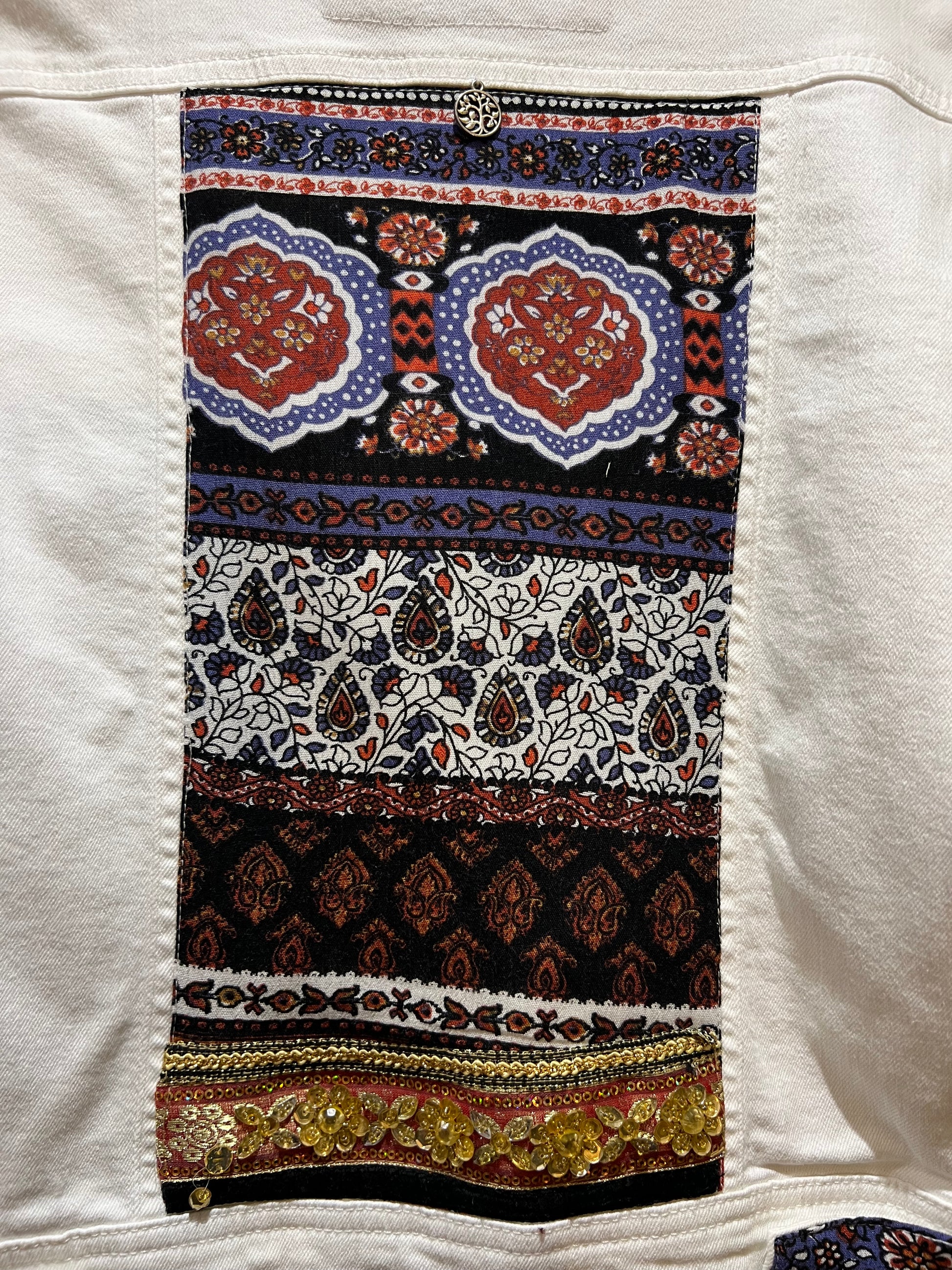 Preloved Denim Jacket laundered, repaired, decorated by hand with re used textiles and trims. Each piece is unique.